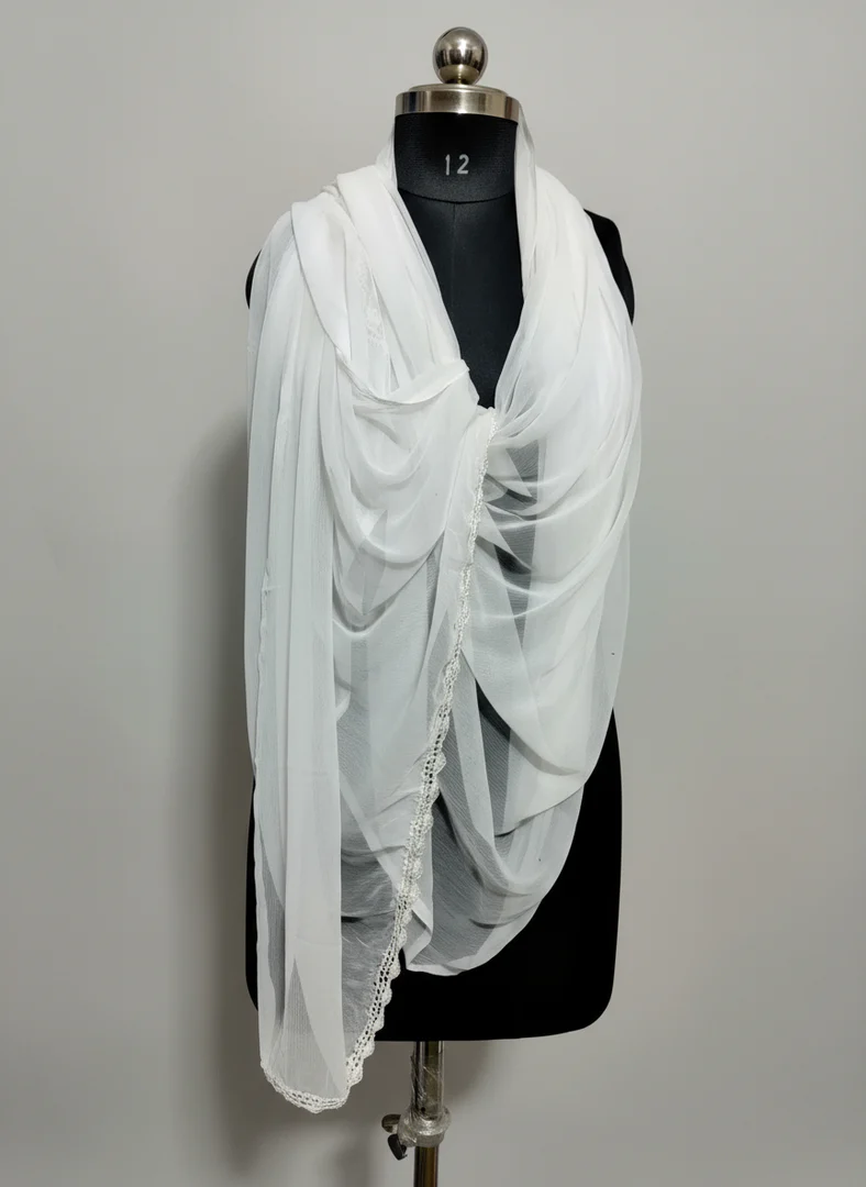 Soft chiffon dyeable dupatta with elegant hand crochet border, 2.25 meters long.